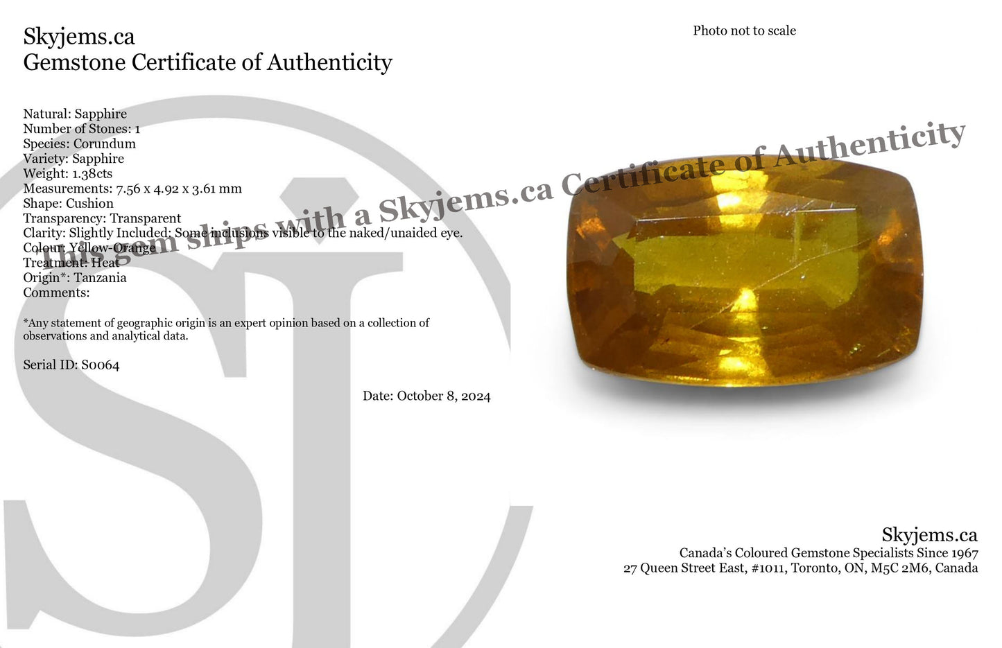 1.38ct Cushion Orange Sapphire from Tanzania, Heated