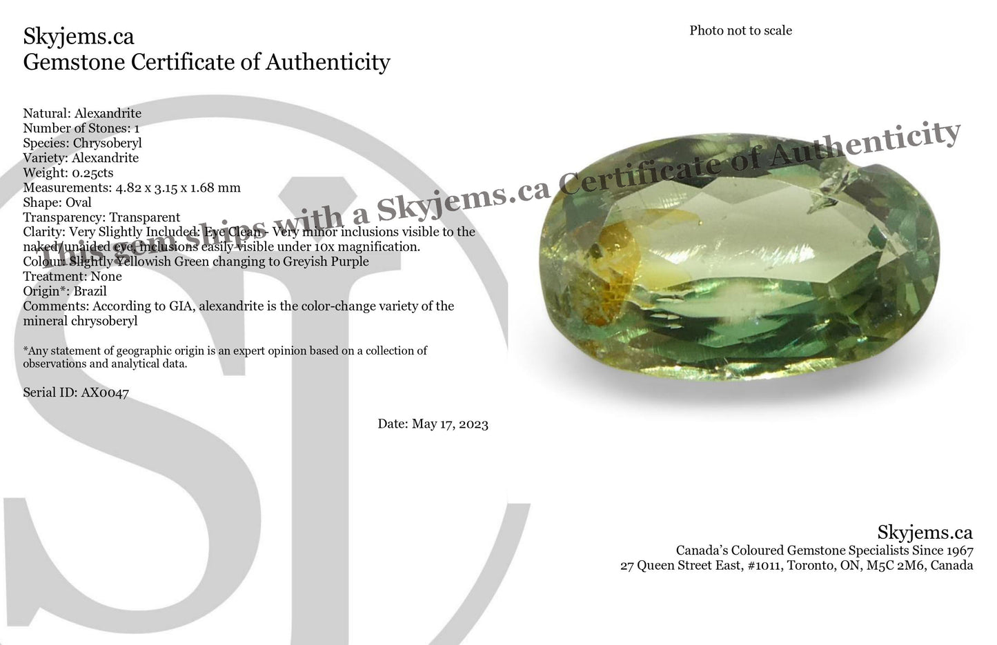 0.25ct Oval Yellowish Green to Greyish Purple Alexandrite from Brazil, Unheated