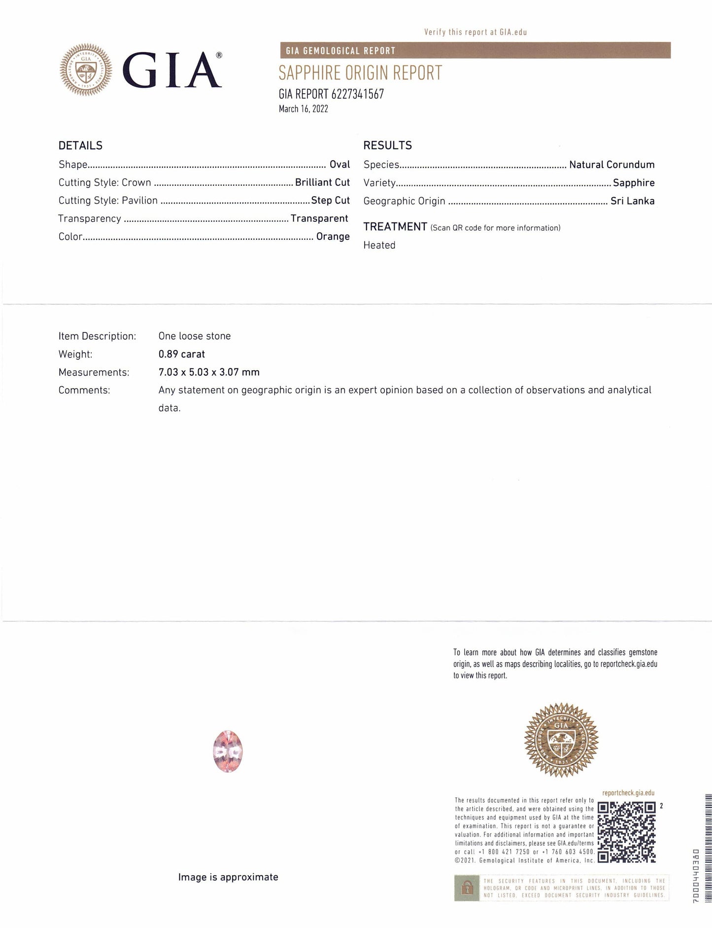 0.89ct Oval Orange Sapphire GIA Certified Sri Lanka