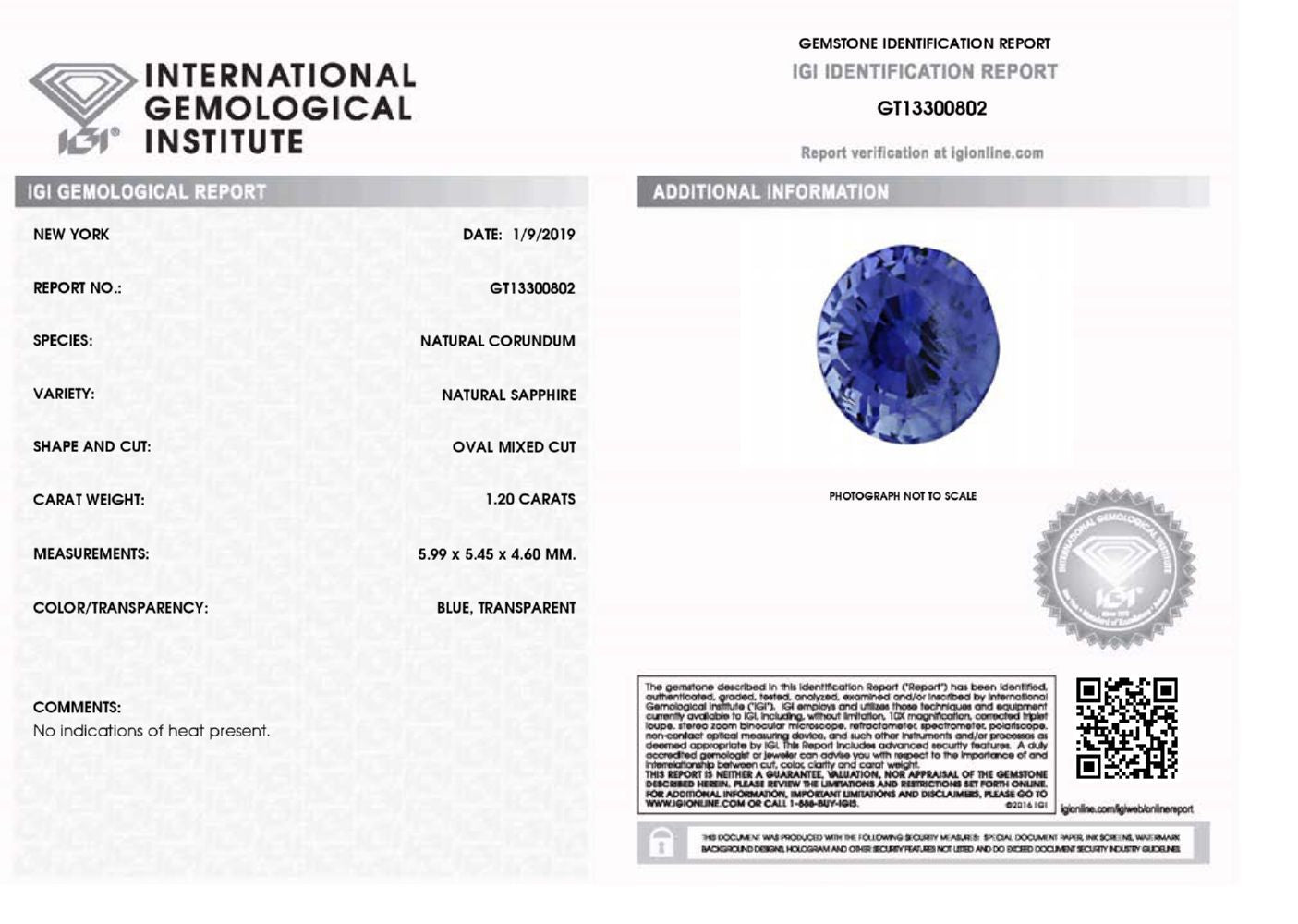 1.20ct Oval Blue Sapphire IGI Certified Unheated, Sri Lanka