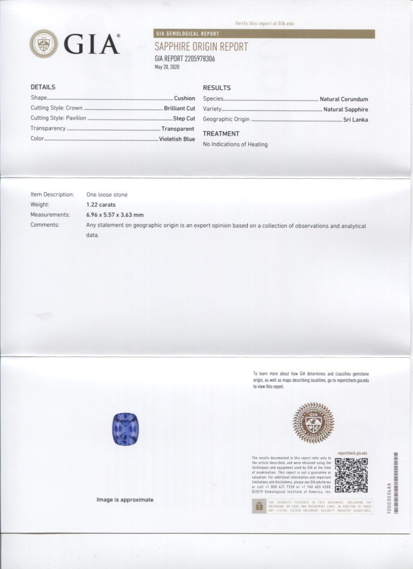 1.22ct Cushion Violetish Blue Sapphire GIA Certified Sri Lanka Unheated