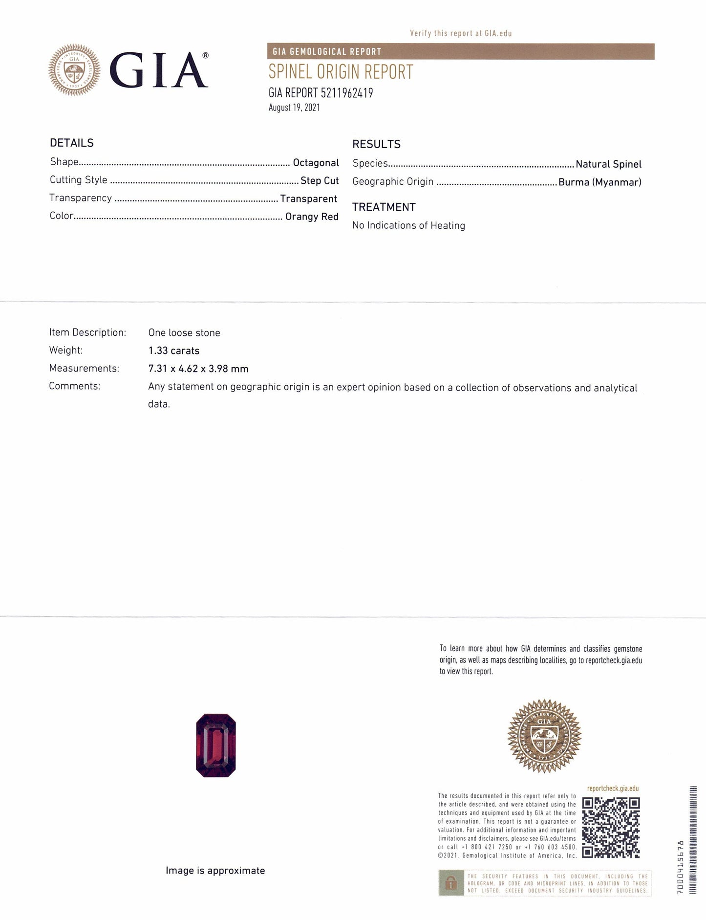 1.33ct Octagonal/Emerald Cut Orangy Red Spinel GIA Certified Burma (Myanmar) Unheated