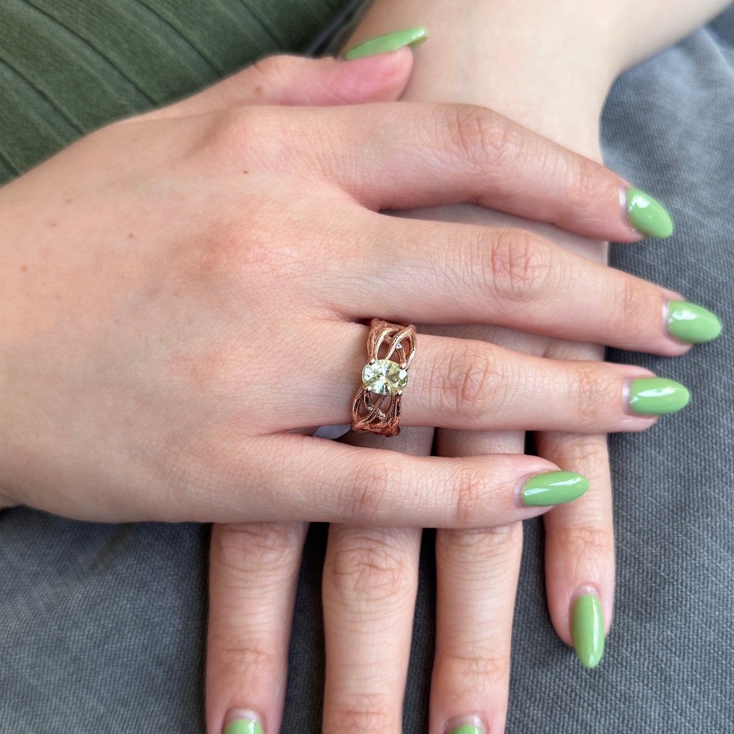 1.34ct Mint Garnet, Diamond Vine Ring set in 14k Rose Gold