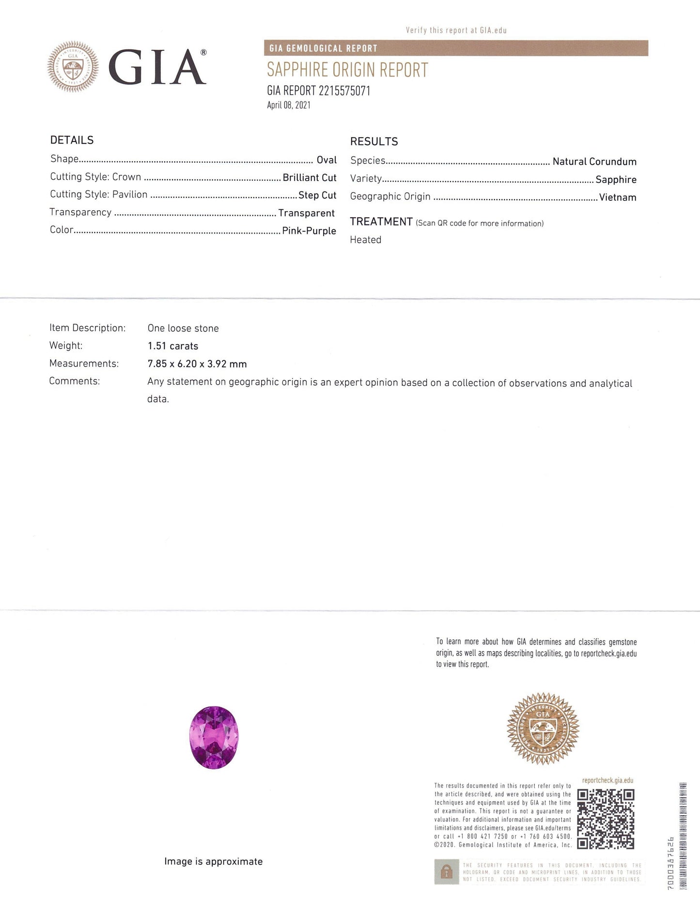 1.51ct Oval Vivid Pink-Purple Sapphire GIA Certified Vietnam