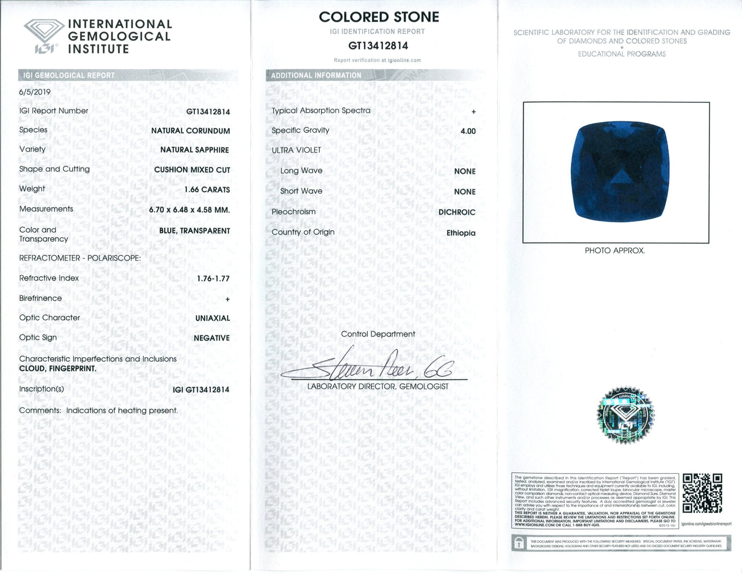 1.66ct Teal Blue Sapphire Cushion IGI Certified Ethiopian