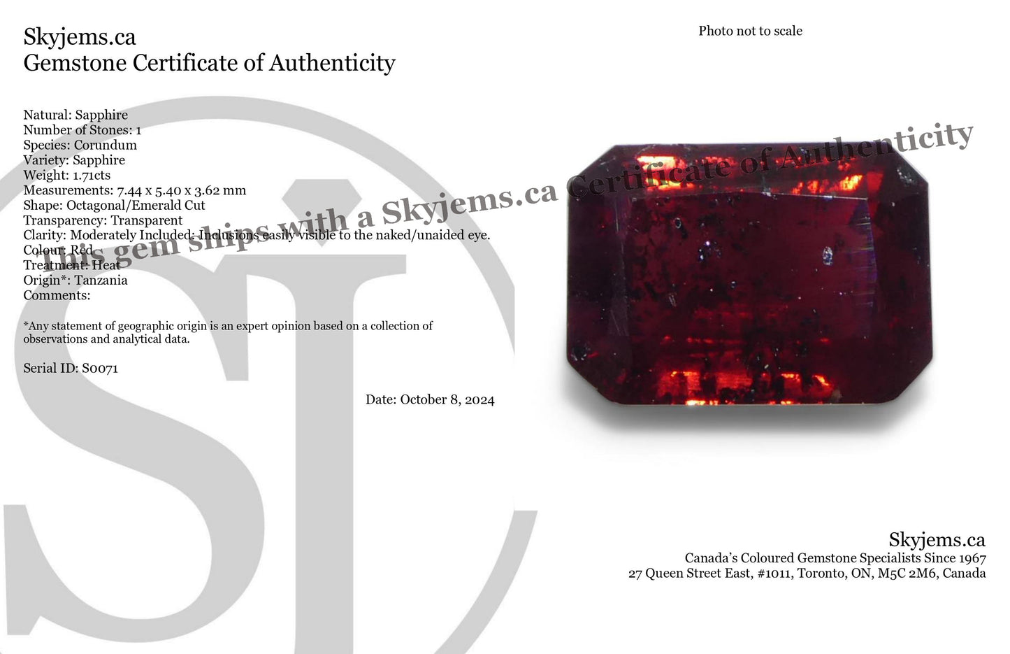 1.71ct Octagonal/Emerald Cut Red Sapphire from Tanzania