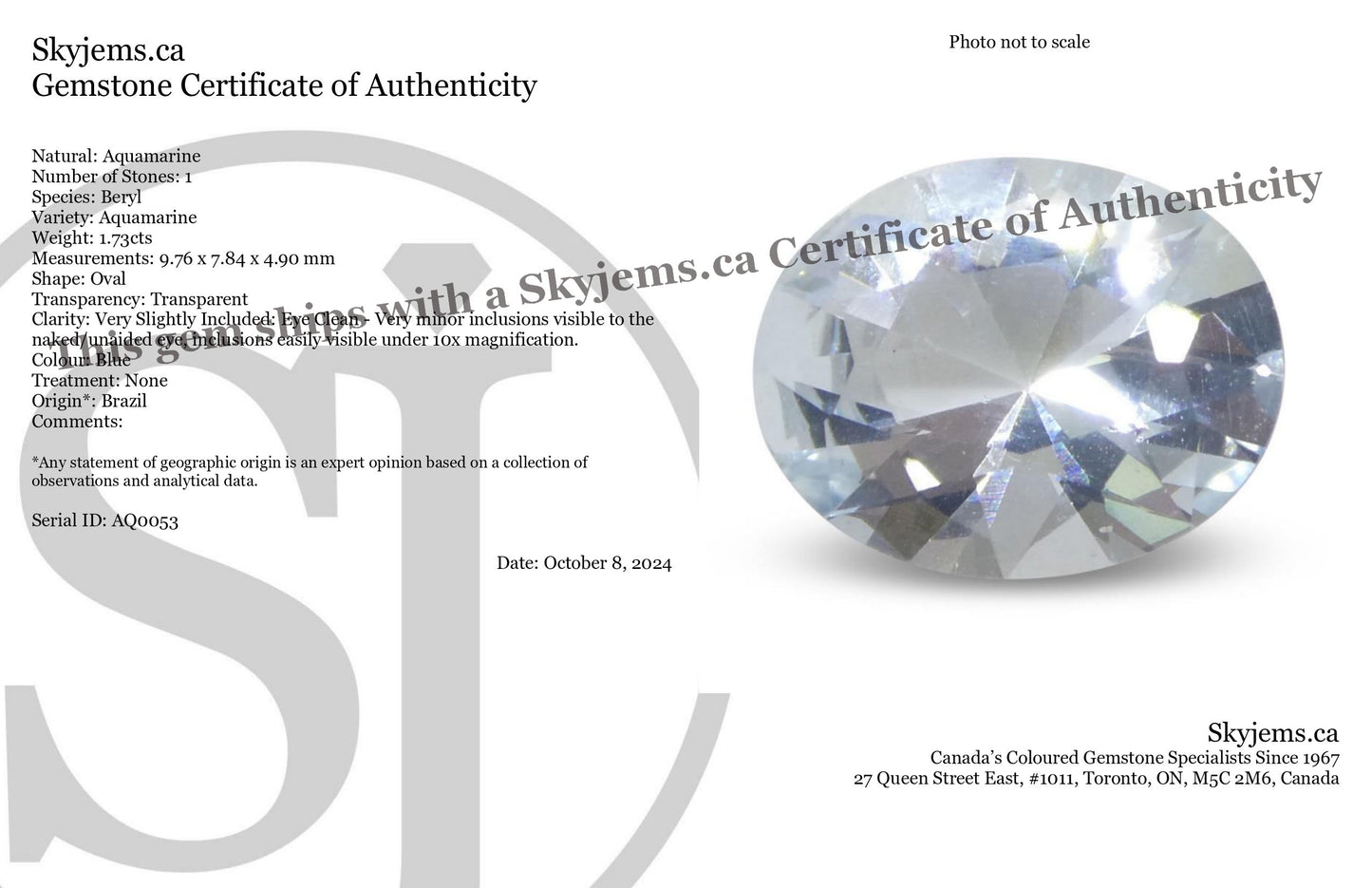 1.73ct Oval Blue Aquamarine from Brazil Unheated