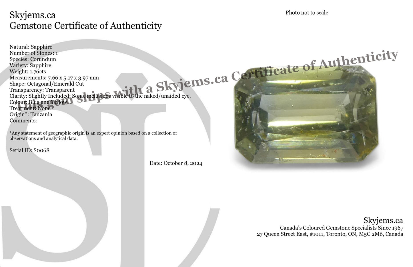 1.76ct Octagonal/Emerald Cut Blue and Yellow Sapphire from Tanzania, Unheated