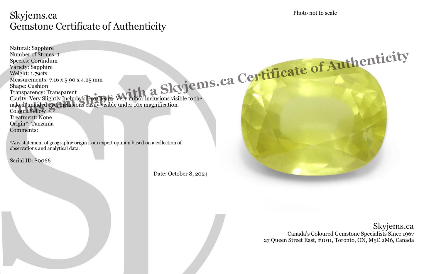 1.79ct Cushion Yellow Sapphire from Tanzania, Unheated