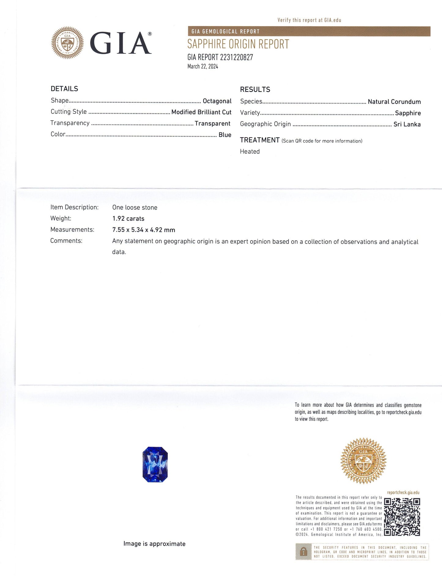 1.92ct Octagonal/Emerald Cut Blue Sapphire GIA Certified Sri Lanka