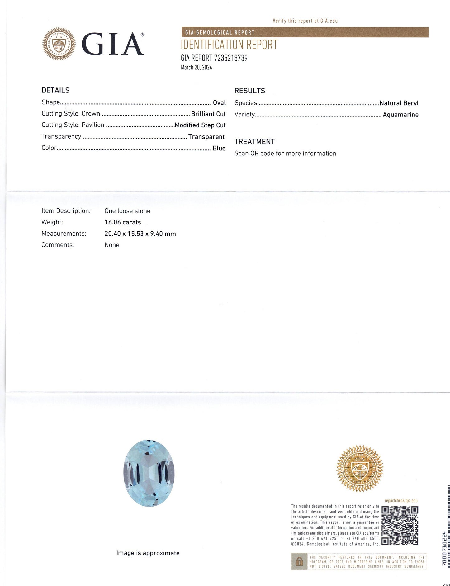 16.06ct Oval Blue Aquamarine GIA Certified Brazil Unheated