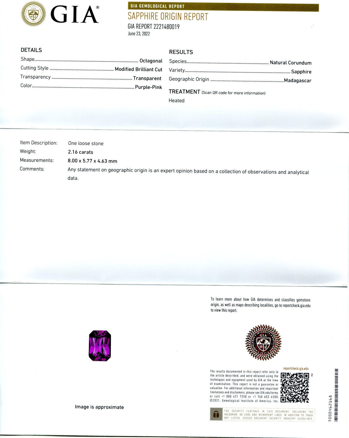 2.16ct Octagonal Purple-Pink Sapphire GIA Certified Madagascar