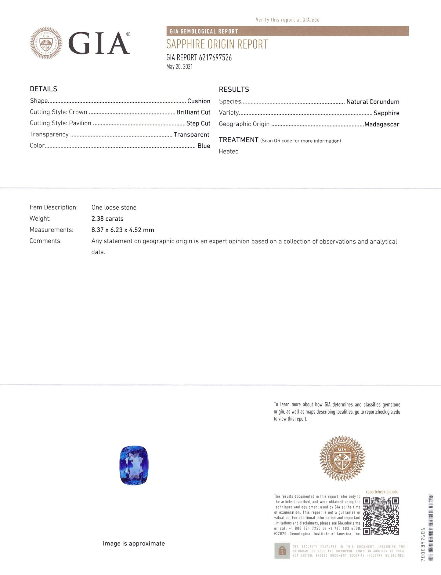 2.38ct Cushion Blue Sapphire GIA Certified Madagascar