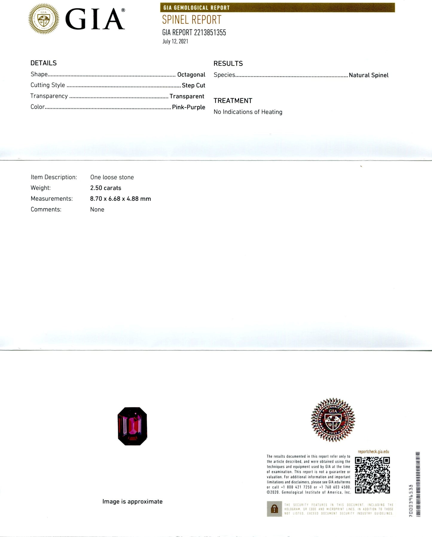 2.5ct Octagonal/Emerald Cut Pink-Purple Spinel GIA Certified Unheated