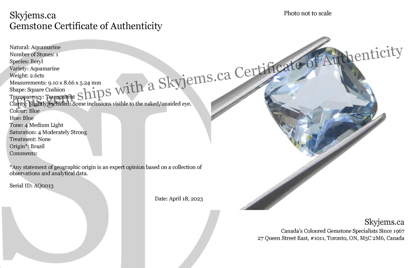 2.6ct Square Cushion Blue Aquamarine from Brazil