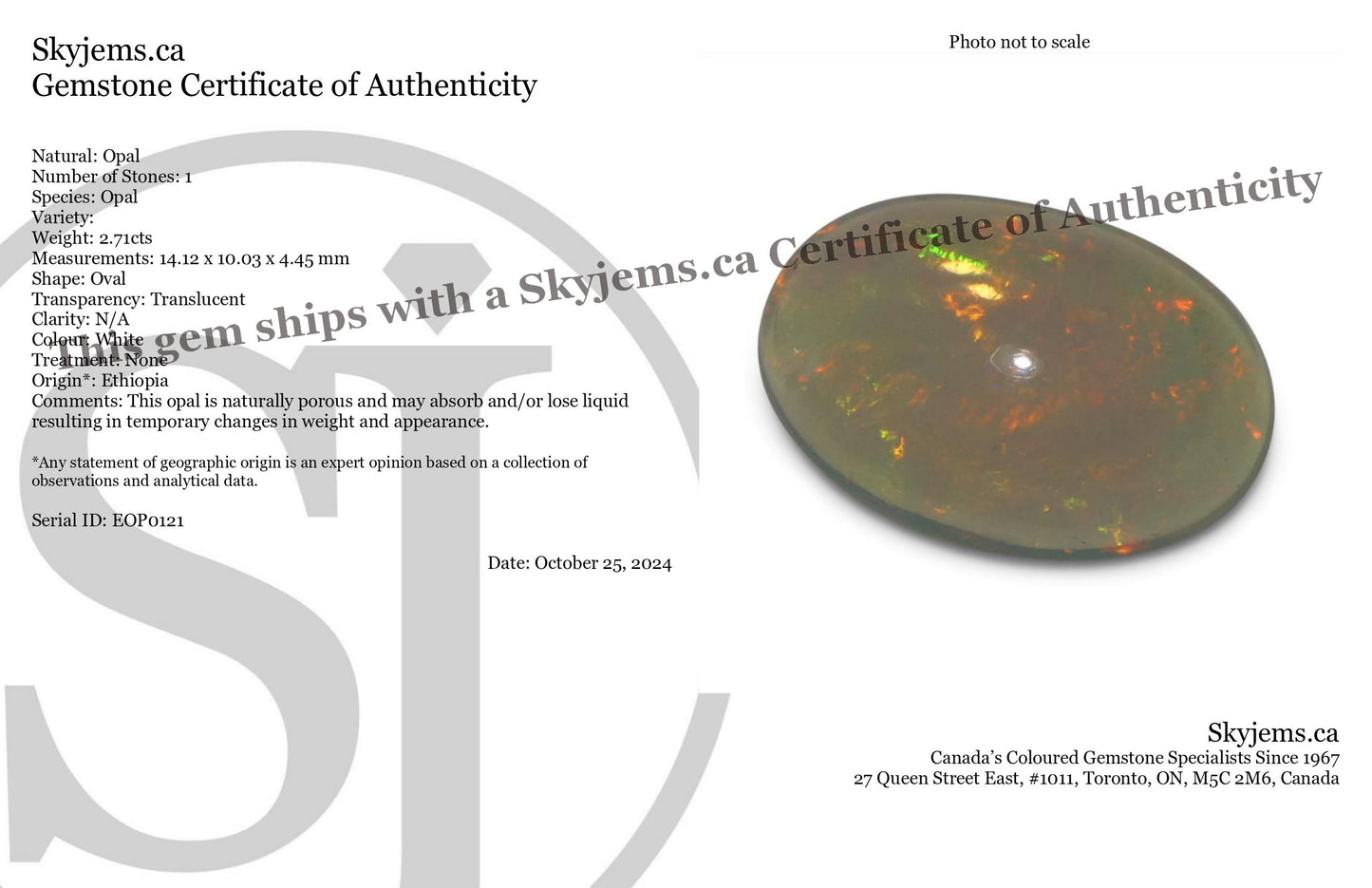 Notes: This opal is naturally porous and may absorb and/or lose liquid resulting in temporary changes in weight and appearance.