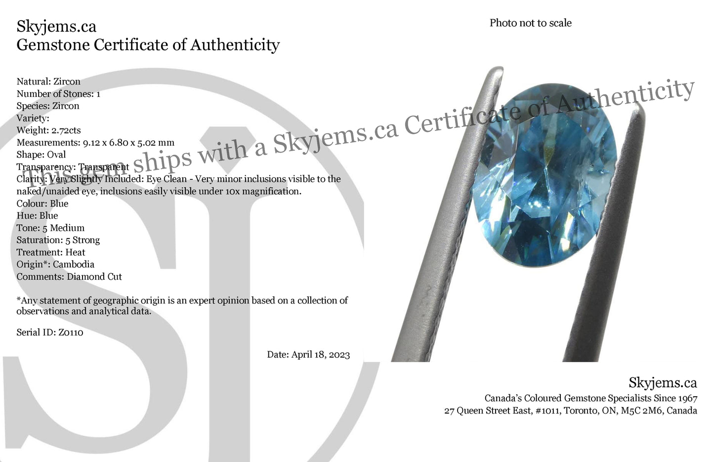 2.72ct Natural Earth Mined Oval Master Brilliant Cut Blue Zircon from Cambodia