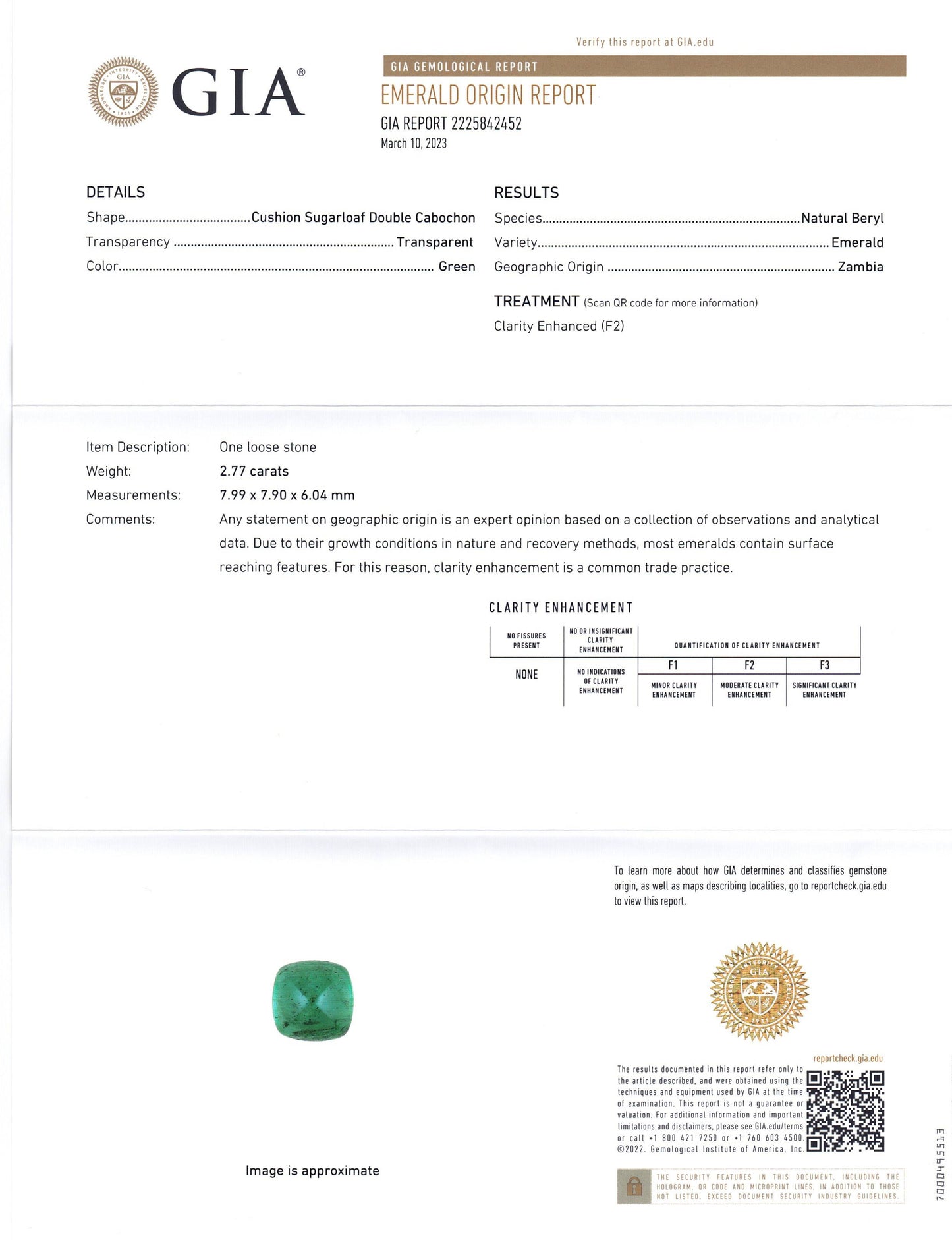 Treatment: Clarity Enhanced (F2). Clarity Enhanced Colorless Oil Only *All Emeralds are Assumed to be Clarity Enhanced