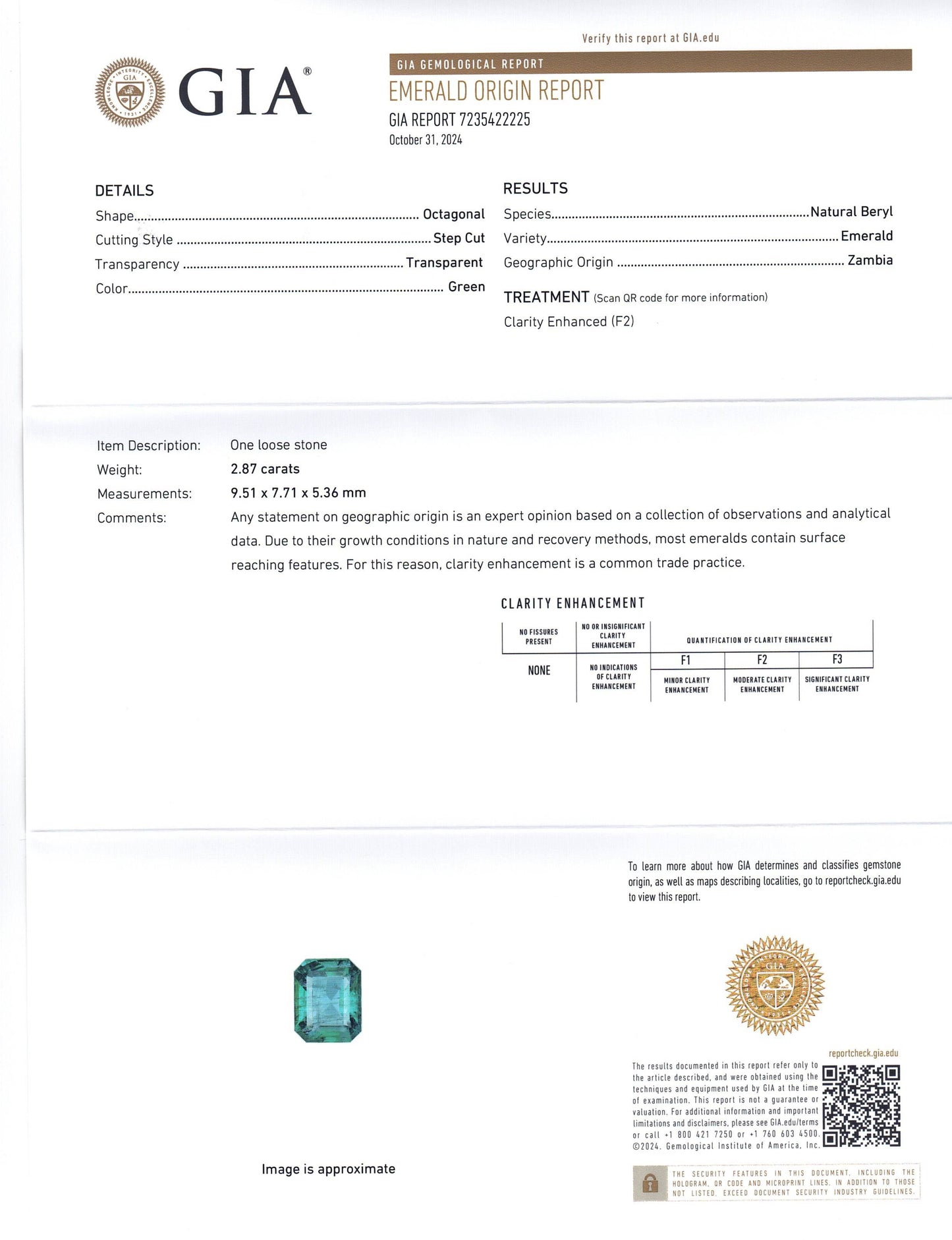 Treatment: Clarity Enhanced (F2). *All Emeralds are Assumed to be Clarity Enhanced