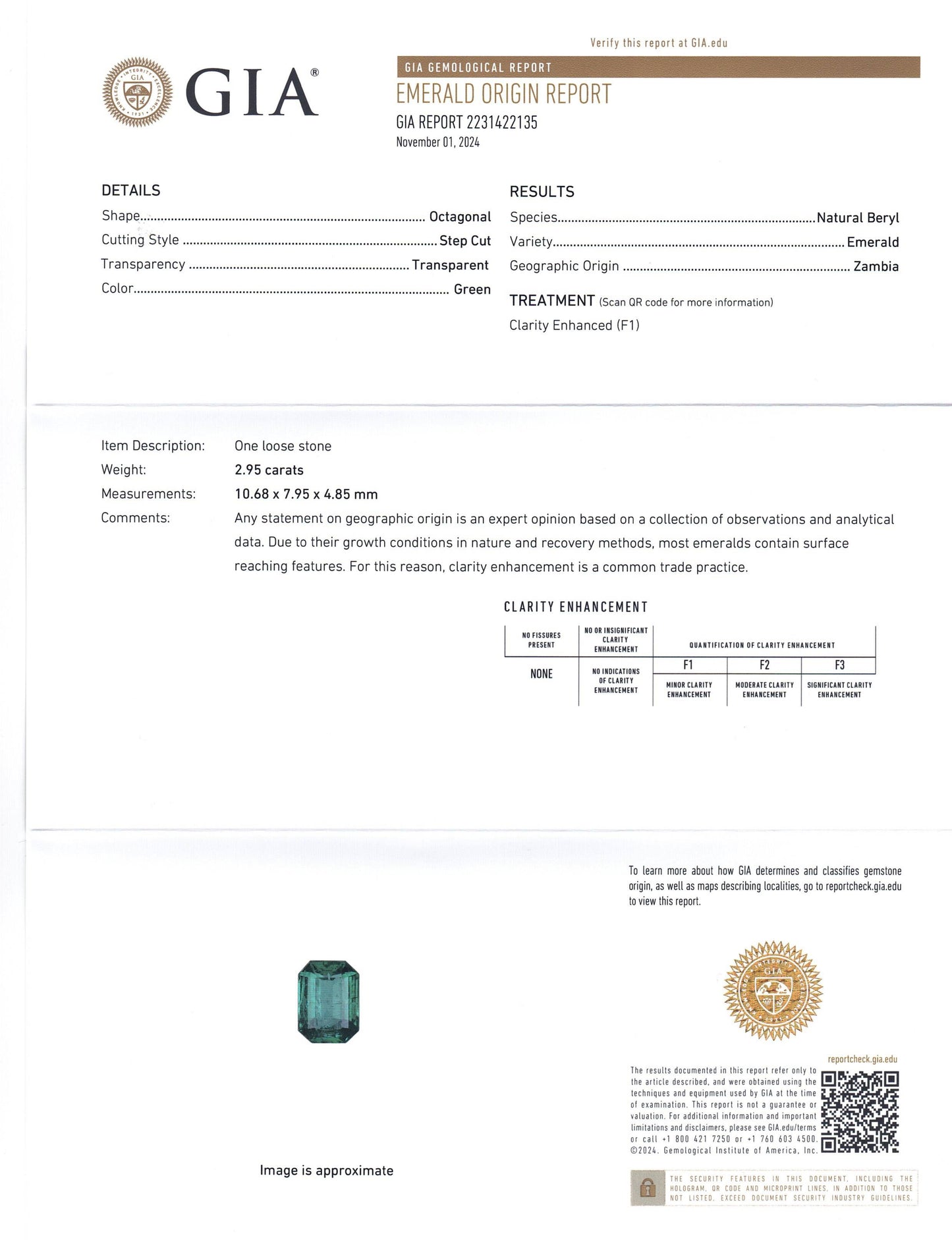 Treatment: Clarity Enhanced (F1). *All Emeralds are Assumed to be Clarity Enhanced