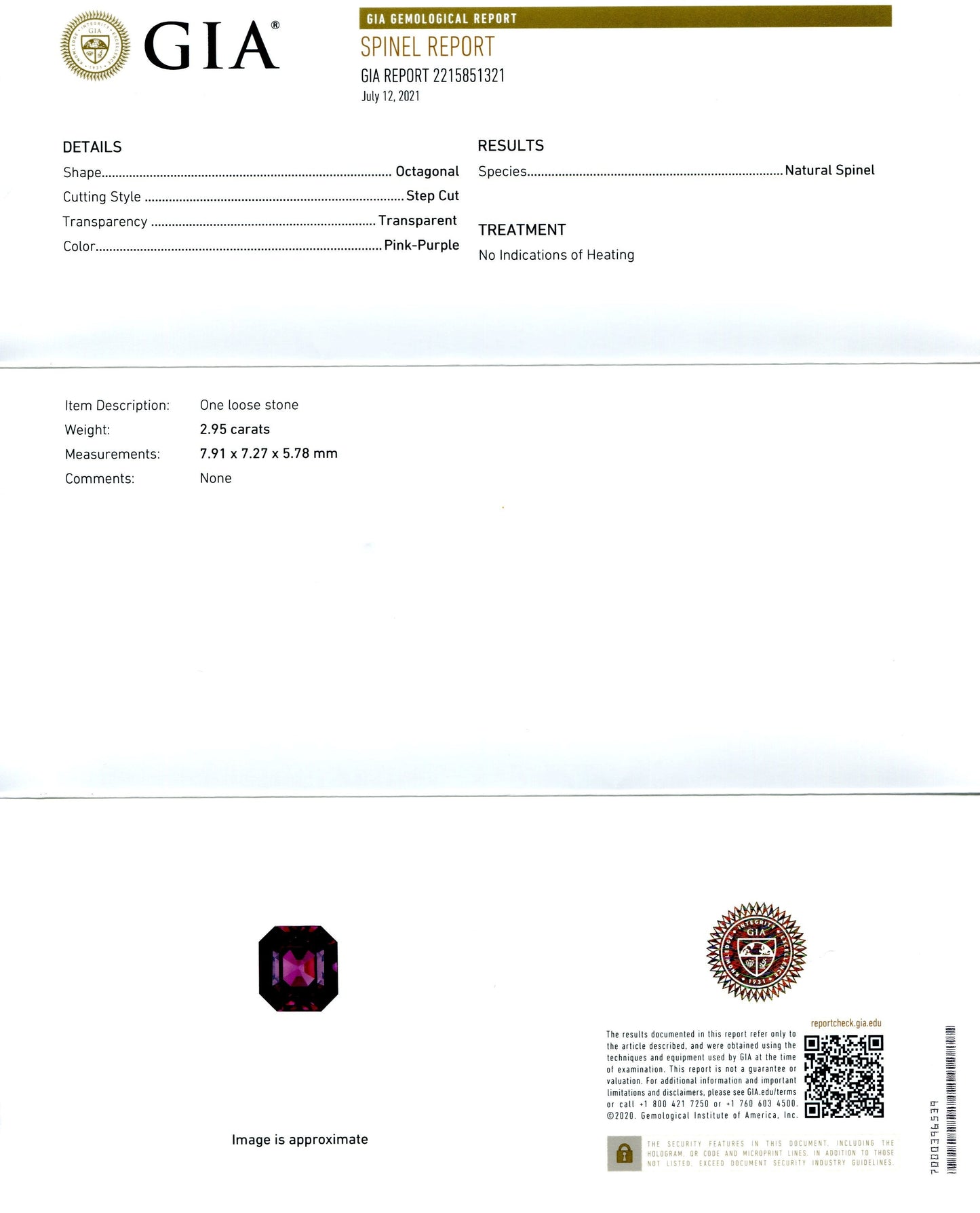 2.95ct Octagonal/Emerald Cut Pink-Purple Spinel GIA Certified Unheated