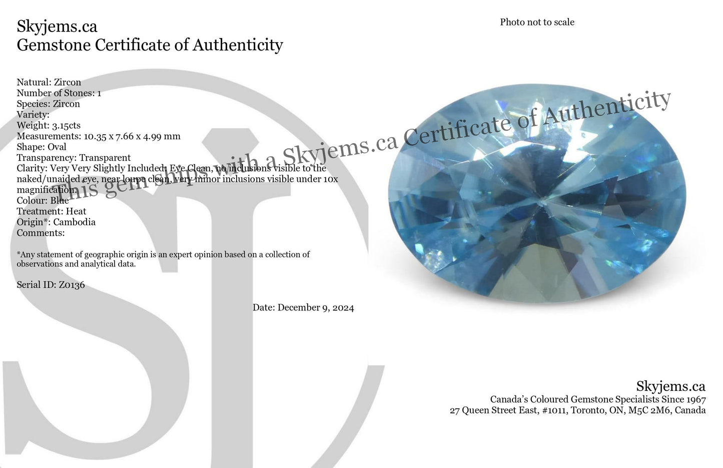 3.15ct Natural Earth Mined Oval Master Brilliant Cut Blue Zircon from Cambodia