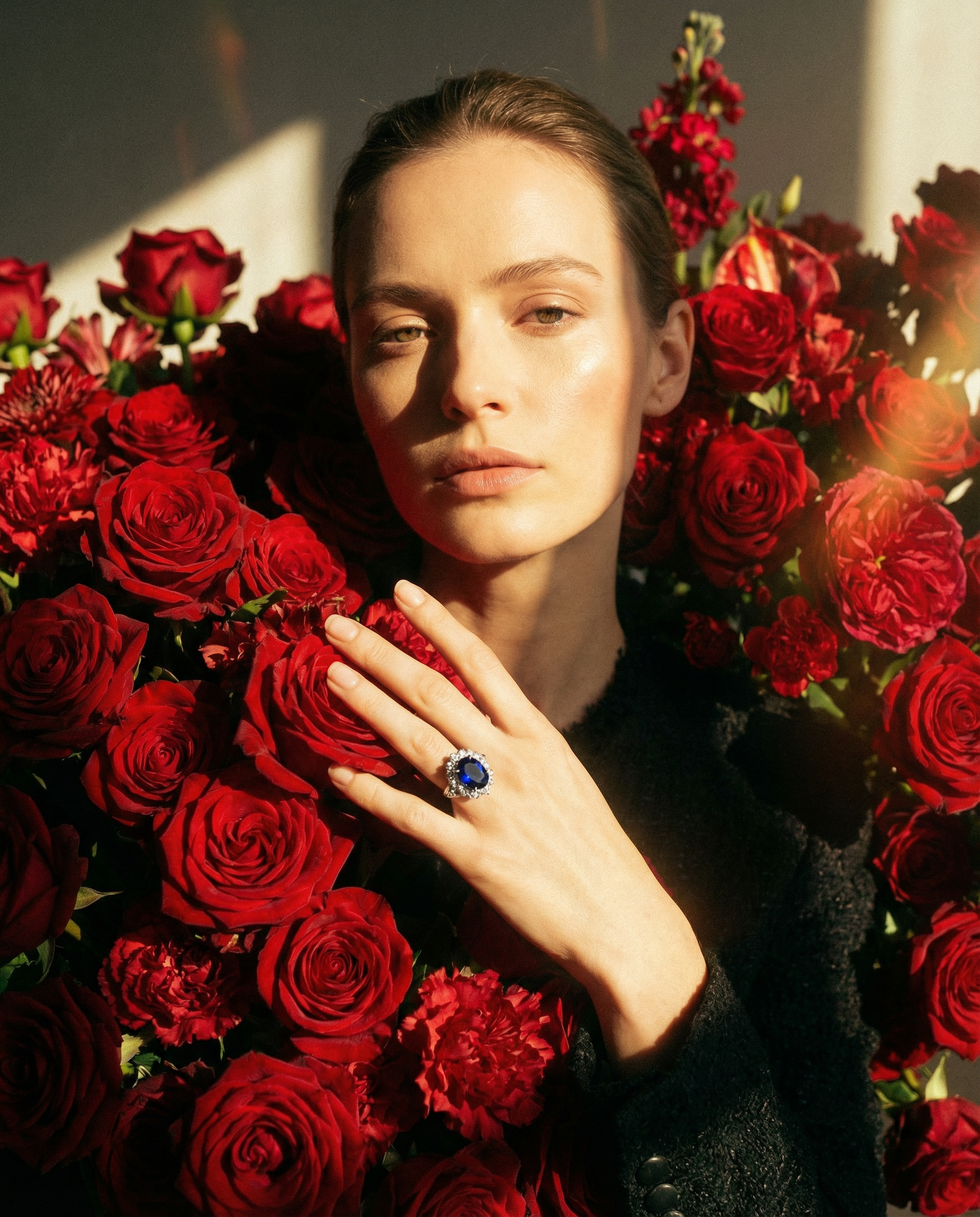 The cushion cut combines classic charm with contemporary grace, offering exceptional colour saturation and a soft, inviting profile. Framed by precision-set diamonds, the centre stone’s radiant hue is beautifully enhanced, creating a luminous contrast that catches the eye from every angle.