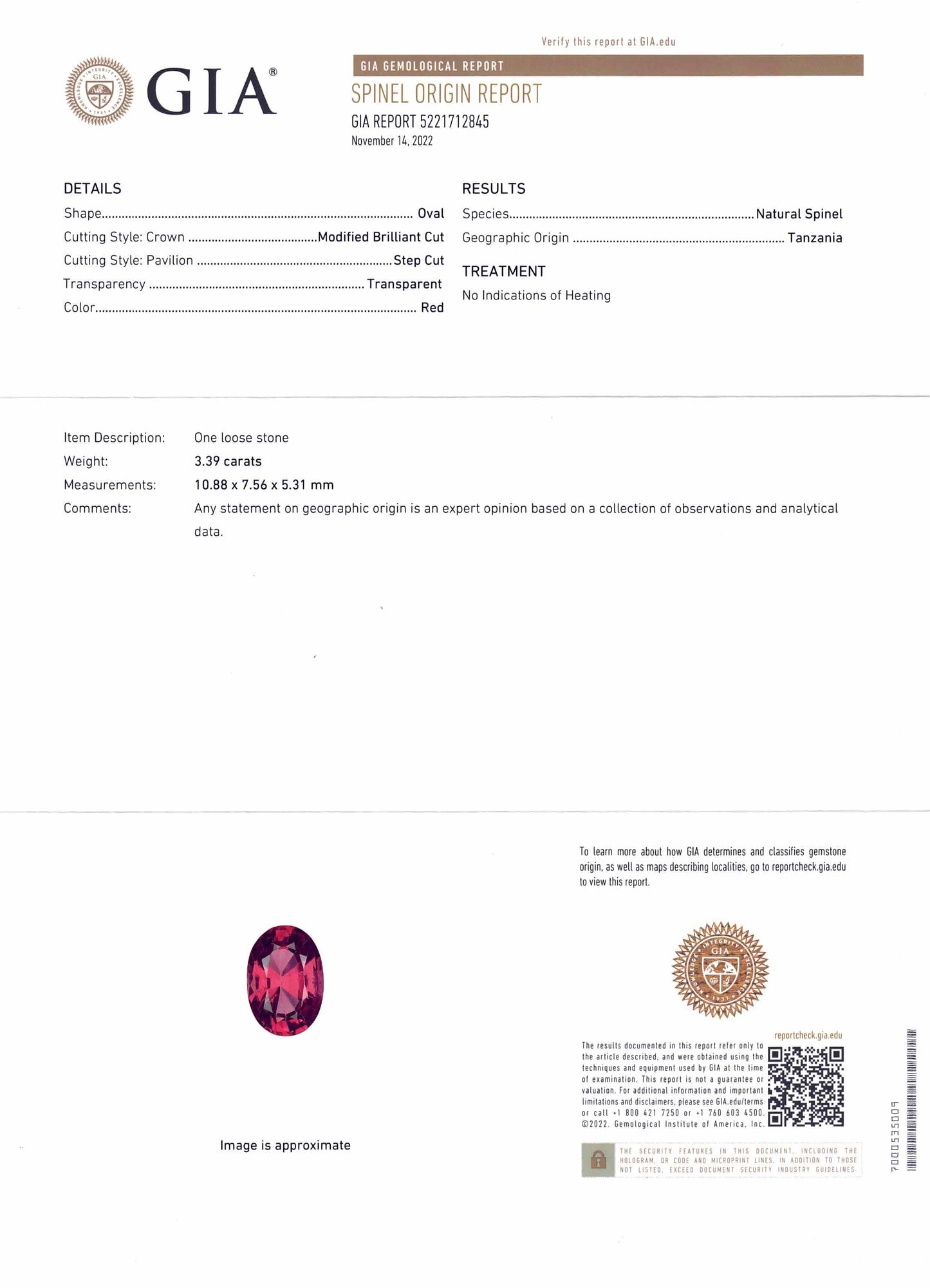 3.39ct Oval Red Spinel GIA Certified Mahenge, Tanzania Unheated