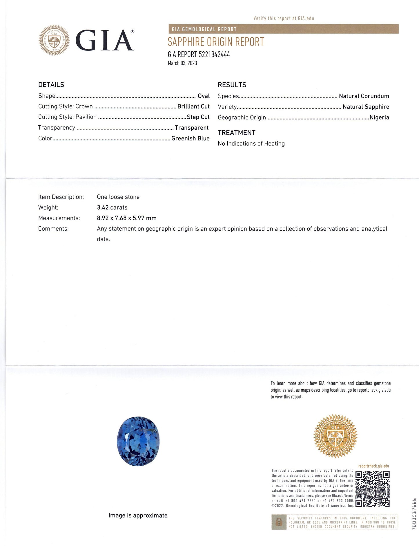 3.42ct Oval Greenish Blue Teal Sapphire GIA Certified Nigeria