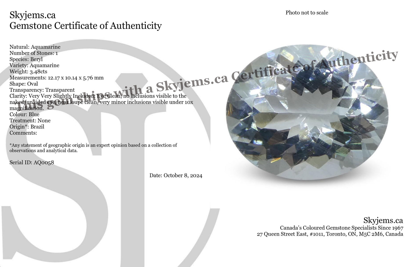 3.48ct Oval Blue Aquamarine from Brazil Unheated