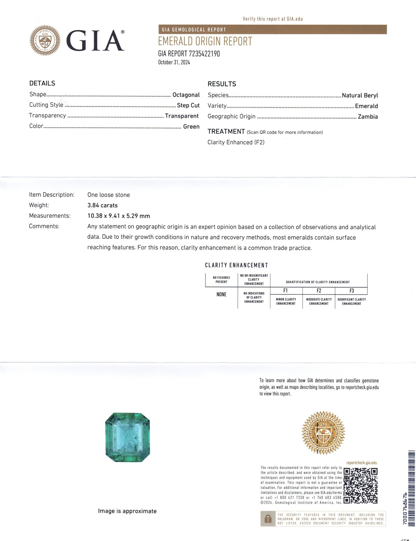 3.84ct Octagonal/Emerald Cut Green Emerald GIA Certified Zambia (F2)