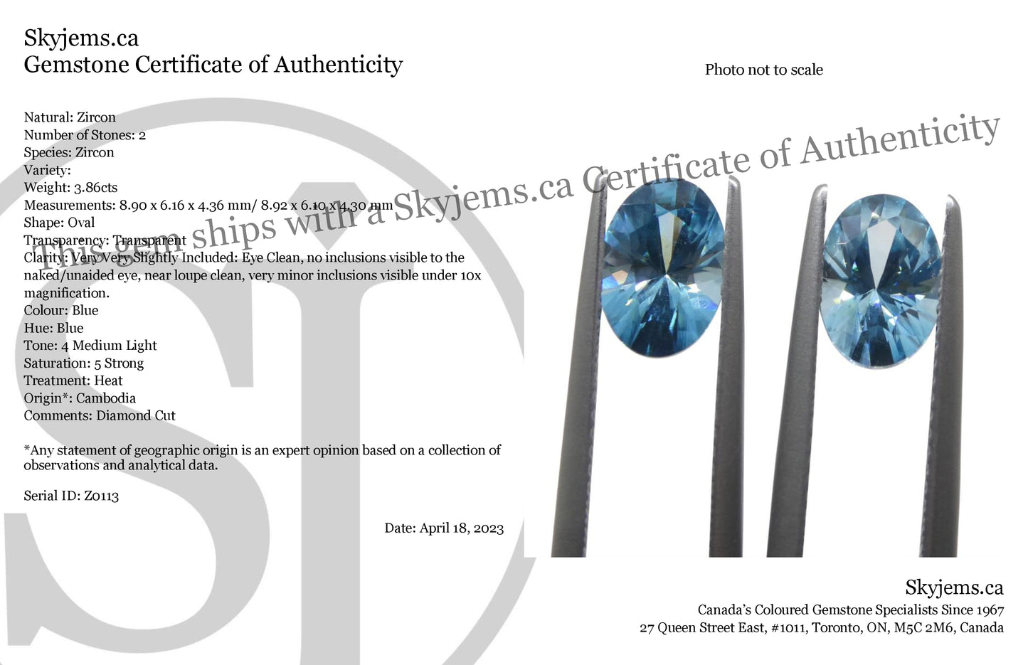 3.86ct Natural Earth Mined Pair Oval Master Brilliant Cut Blue Zircon from Cambodia