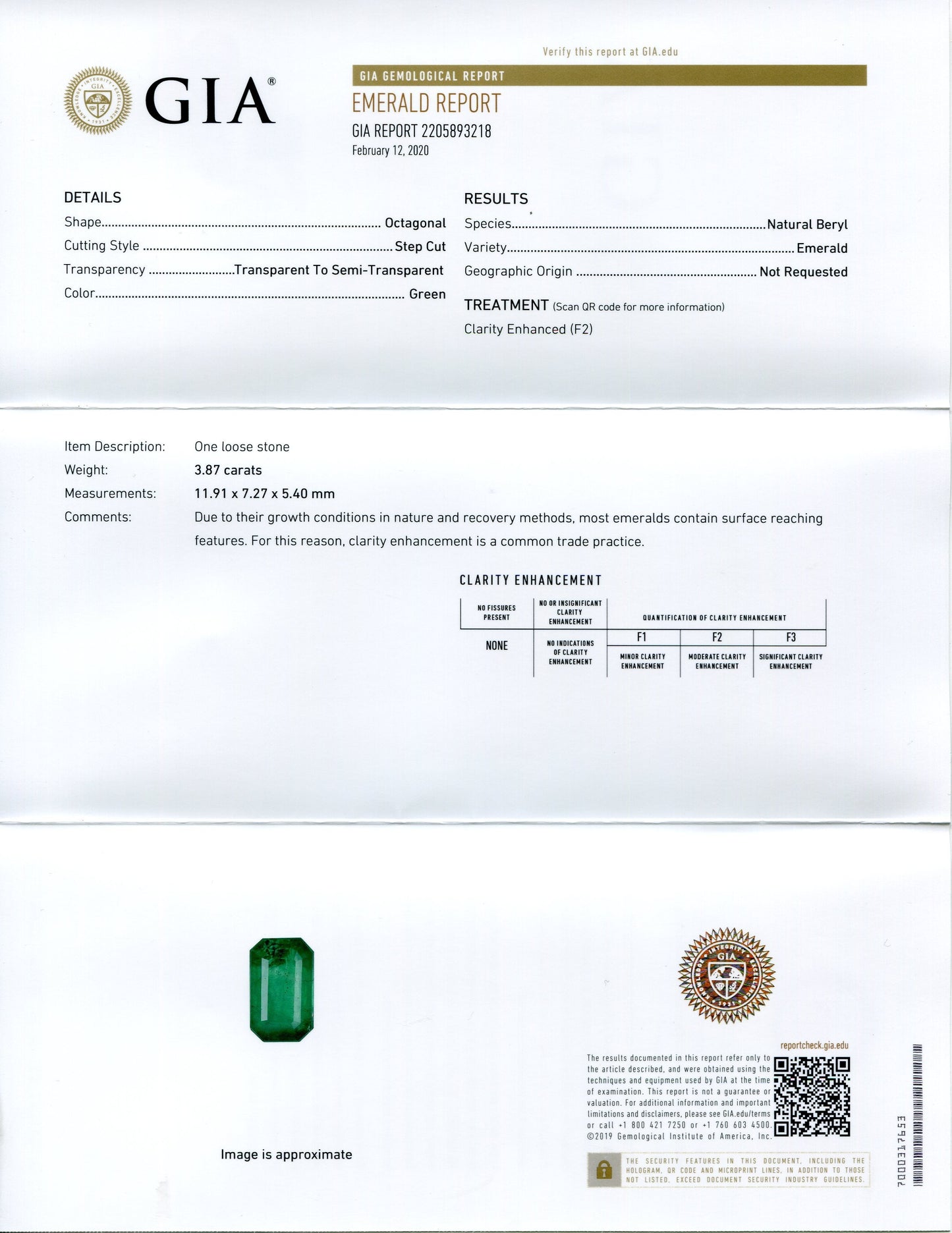 3.87 ct Octagonal/Emerald Cut Emerald GIA Certified