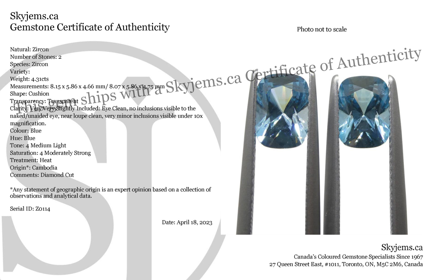 4.31ct Natural Earth Mined Pair Cushion Master Brilliant Cut Blue Zircon from Cambodia