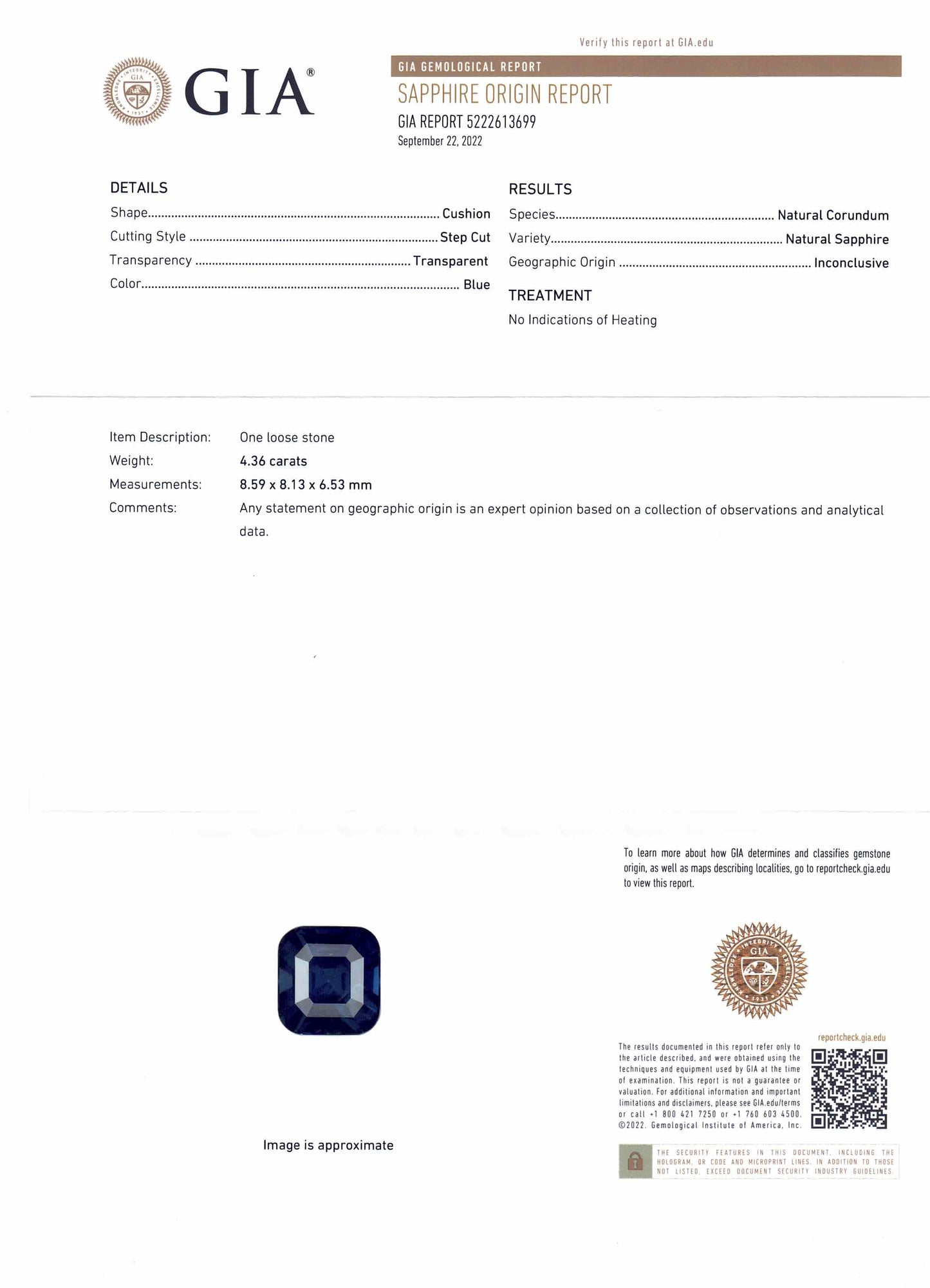 4.36ct Cushion Blue Sapphire GIA Certified Unheated