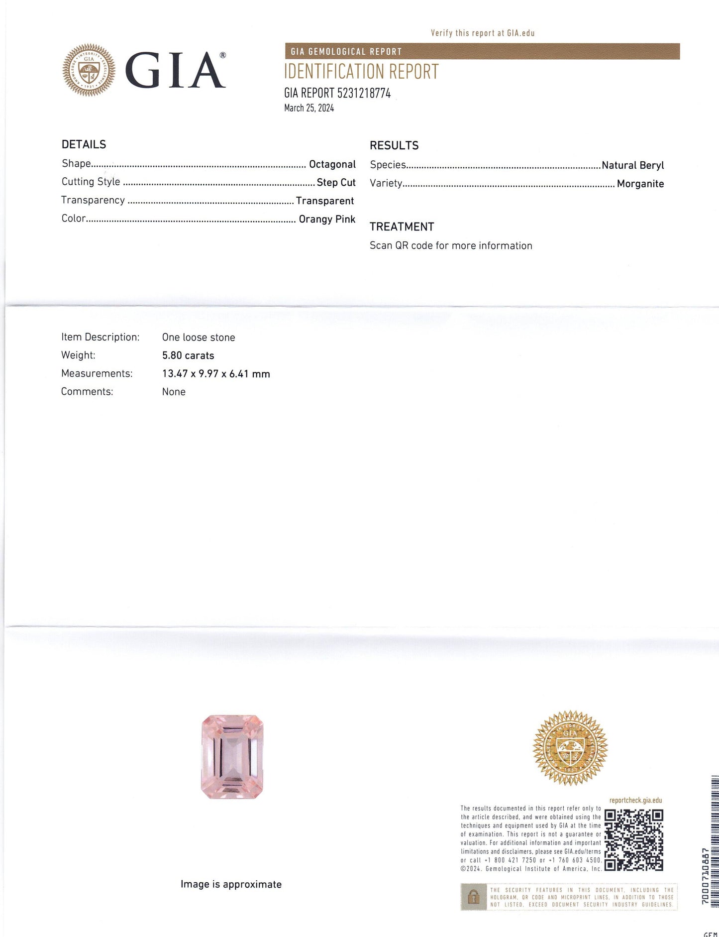 5.8ct Octagonal/Emerald Cut Orangy Pink Morganite GIA Certified Brazil Unheated