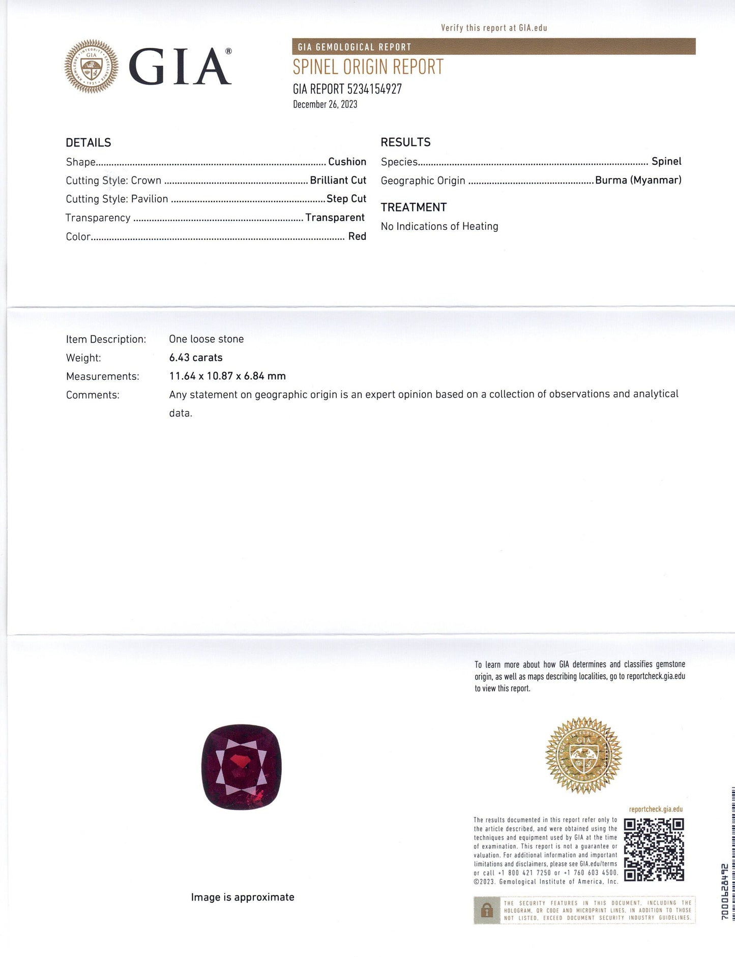 6.43ct Cushion Red Spinel GIA Certified Burma (Myanmar) Unheated
