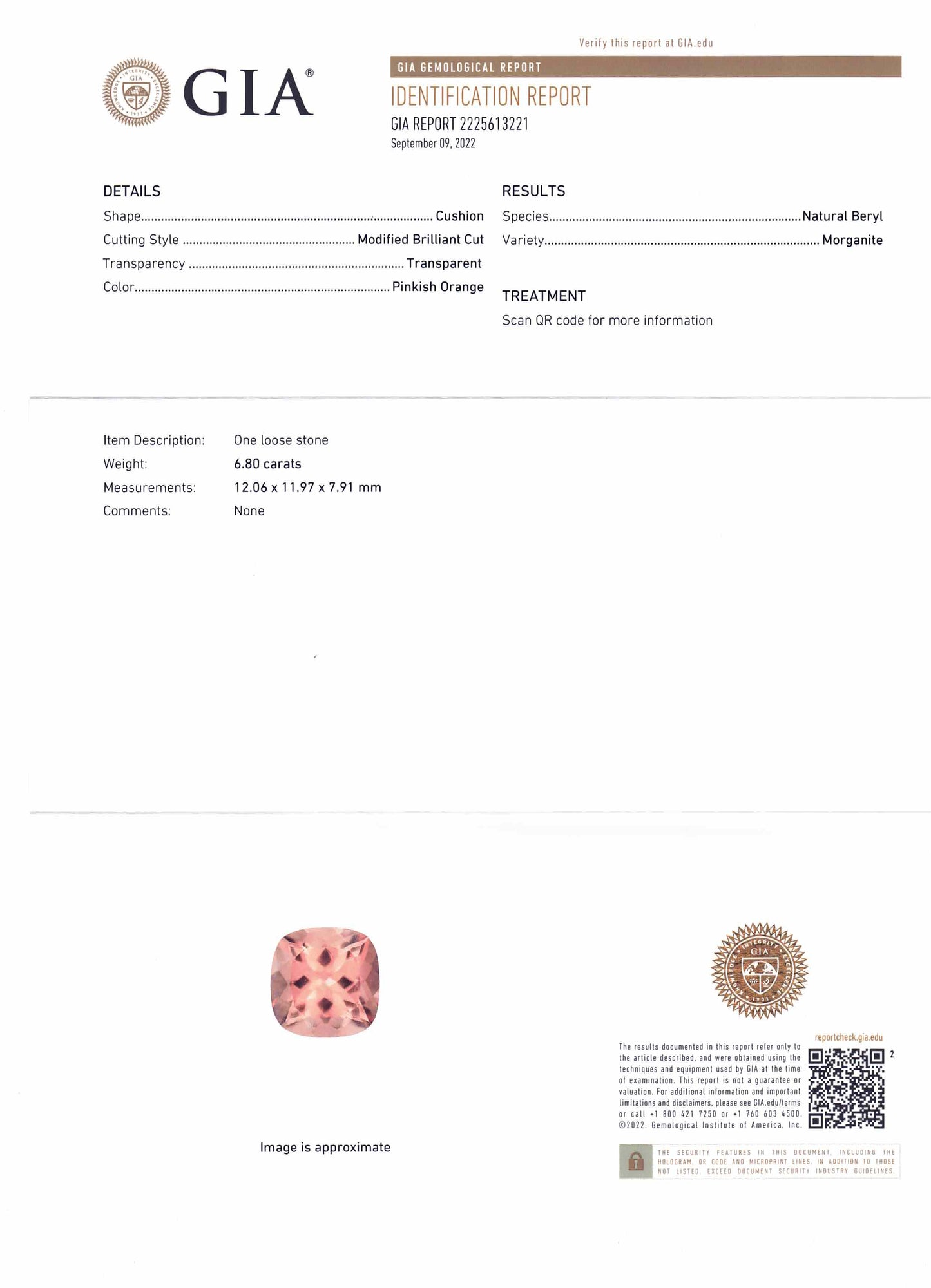 6.8ct Cushion Pinkish Orange Morganite GIA Certified