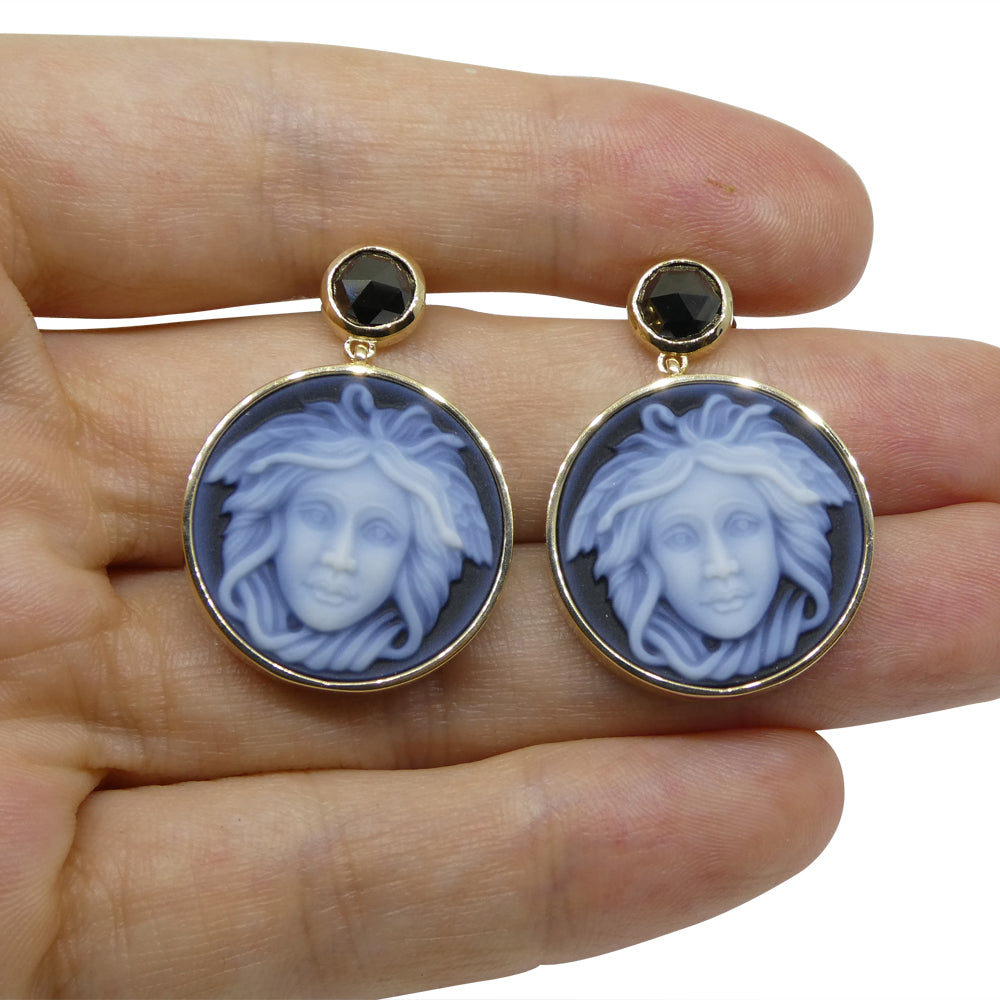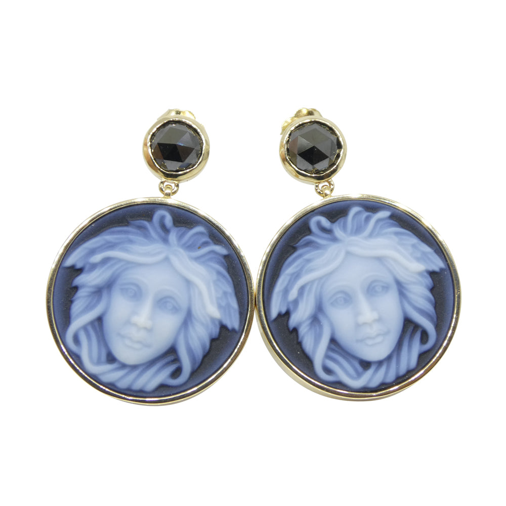 Black Agate Medusa Cameo Earrings with Rose Cut Black Diamonds set in 14k Yellow Gold